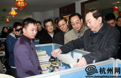 杭州网讯 玉兔欢歌辞旧岁,金龙摆尾迎新春。在新春佳节来临之际,今天上午10点,带着对新闻工作者的诚挚问候和对新闻工作的殷切希望,浙江省委常委、杭州市委书记黄坤明,市委副书记叶明,市委常委、秘书长许勤华,市委常委、宣传部长翁卫军等,来到杭州日报报业集团,走访慰问新闻工作者。在杭报集团党委书记、社长李建国,总编辑赵晴的陪同下,市领导一行首先来到了杭州网,亲切问候杭州网采编人员,并通过杭州网向网民拜年。