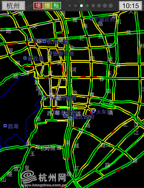 10点15分杭州主城区的实时路况,只有极少数路口拥堵。(画面为杭州路况软件截图,由杭州综合交通研究所提供)