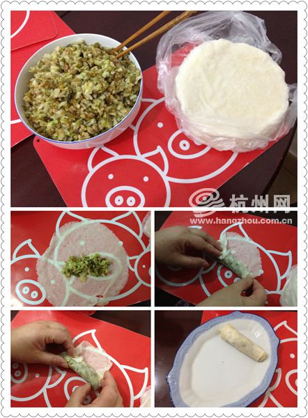 排在队伍后面的老伯告诉记者,杭州人过年,春卷是必不可少的一道菜。图个新鲜,大家都在除夕当天一大早来排队买。“你看,这么热乎乎的刚刚做出来的毛新鲜咧。”大伯说,春卷的陷自己家里都备好了,就等着这皮子。