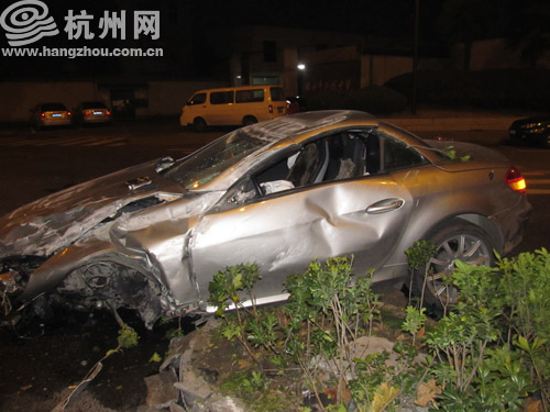杭州网记者核实:事发时间是今天凌晨3点50分左右,在江城路北向南方向,雄镇楼转盘附近,一辆奔驰s350汽车冲进绿化带里。
