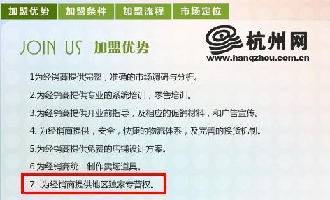 在“非常物语”女装品牌的网站上,“地区独家专营权”被视为加盟优势。