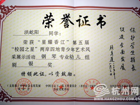2月上旬,在深圳麒麟山景大酒店刚刚落下帷幕的“星耀香江”第五届“校园之星”全国比赛中,喜洋洋幼儿园的洪屹阳喜获器乐(钢琴专业)幼儿组别银奖,并授予“未来之星”中国优秀特长生荣誉称号。
