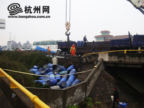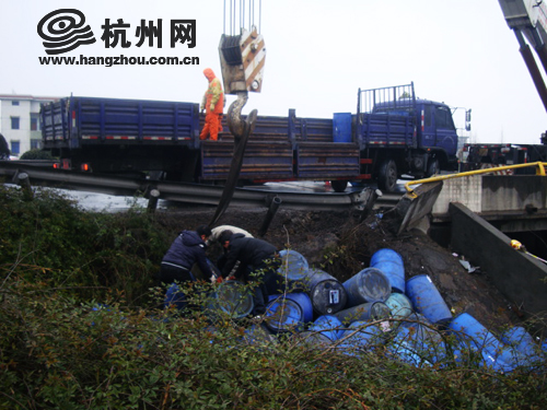 16:15分 记者获悉,经过路政、交警、环保、环境检测、消防、高速业主、施救、养护单位等单位的共同努力,截止下午16点,事故路面已处理完毕,通行正在缓慢恢复当中。对于流入河道中的桶装化学品,环保、环境等相关部门已展开了全面的检测处理工作。