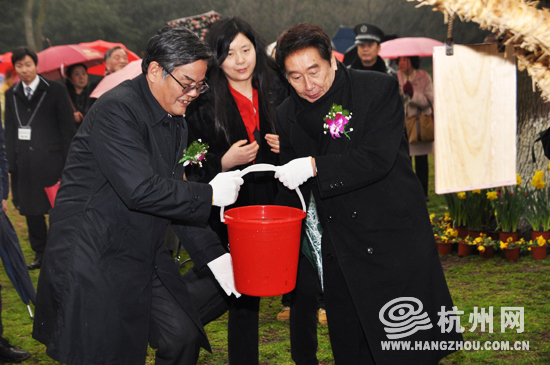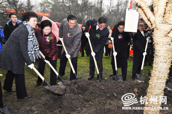 今天,日本岐阜市市长、议长再次率日本各界访华团110余人来到西湖柳浪闻莺公园“日中不再战”纪念碑前,与杭州市市长邵占维、副市长佟桂莉、市人民政府外事办公室主任谢国建、市人民对外友好协会会长虞荣仁等领导,共同参与“中日友好碑文交换50周年”纪念植树活动。