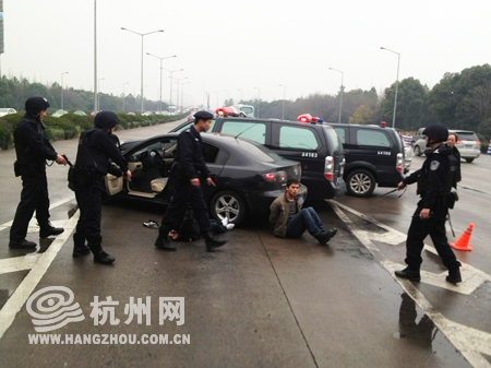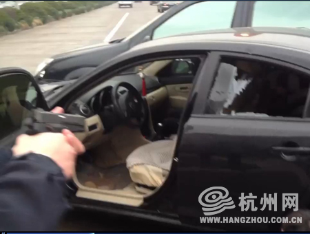 杭州网讯 警匪飞车大战,警察果断下手,撞停匪徒车辆,荷枪实弹的警察敲碎车窗把歹徒从车里揪出来。