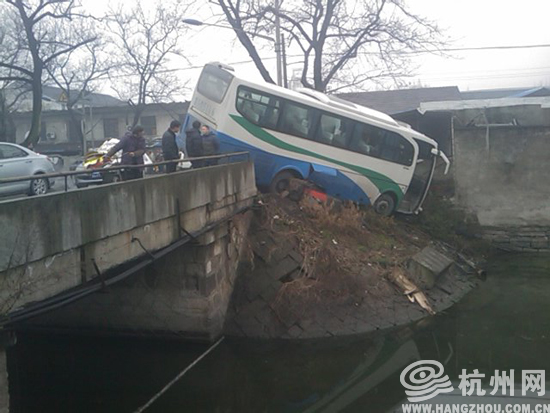 据事发后赶赴现场的萧山数字城管谢云龙介绍,当时大巴车车头冲着河,悬在桥边,所幸里面的人很快被救出。