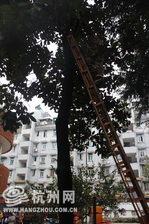消防队员架好了9米消防梯,爬上树,慢慢向鸡靠近。