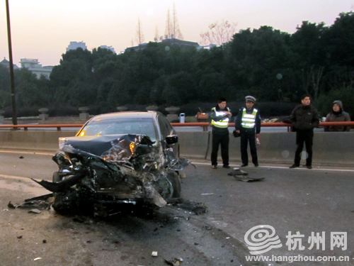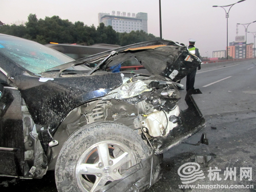 杭州网记者核实报道:记者赶到现场时,这辆绍兴牌照的本田小车横在马路中央,占据着两个车道,车头严重变形,前挡风玻璃破碎,驾驶舱内安全气囊全部弹出,撞击的碎片散落一地。