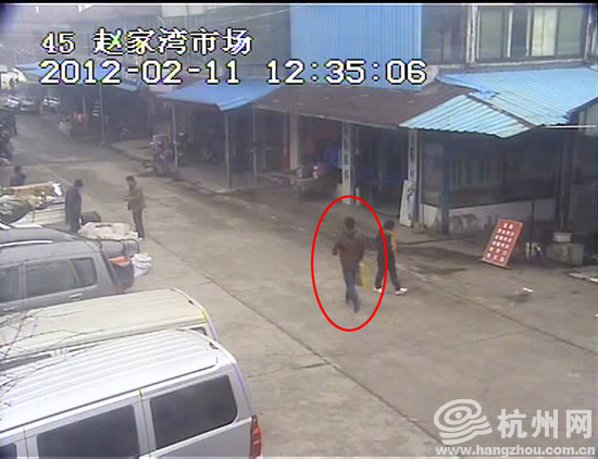 男性嫌疑人逃跑(右手黄色袋子内装着偷来的笔记本电脑)