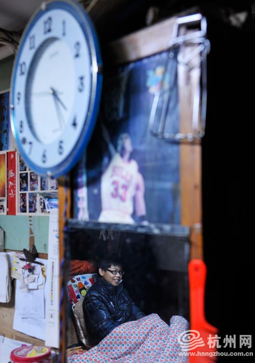 门旁用钉子钉了一块镜子,镜子上方贴了一张NBA球星的海报。小童也喜欢篮球,幻想着有一天,自己也能像林书豪一样。