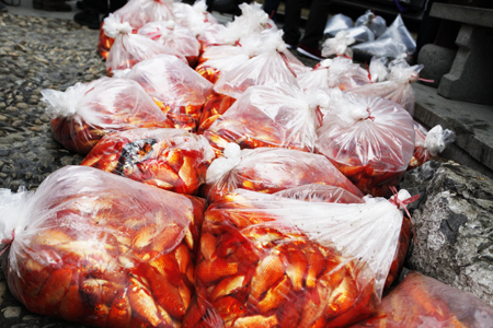 下午1:30,满载着1700多斤金鲫鱼和螺蛳青的大车缓缓驶进花港观鱼公园,他们被分装在装有水和鼓满空气的袋子里,单是金鲫鱼,就足足88袋。