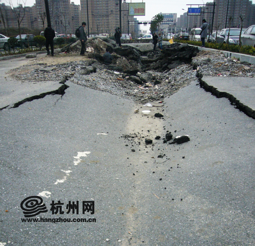 杭州网讯 2月27日下午位于杭州九堡客运中心站附近的胜稼路出现大面积路面塌陷,杭州网记者第一时间赶到现场进行报道。详见《九堡客运站附近路面塌陷 半年内修了三次(图 视频)》