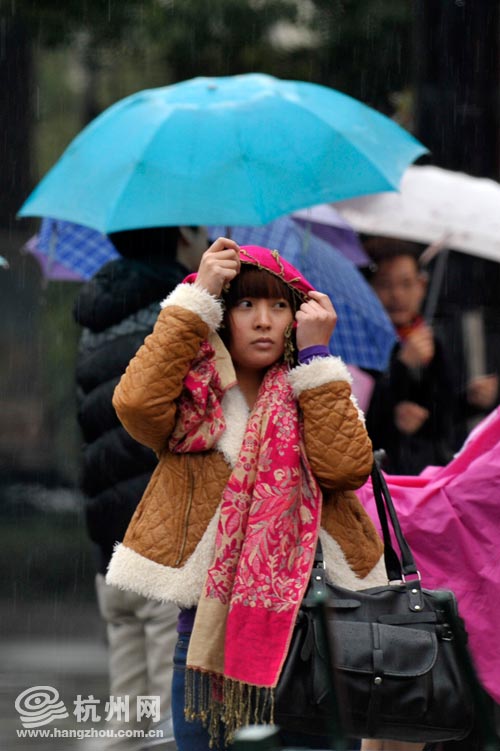 下午4点左右,体育场路上一位等车的女孩把围巾摭在头上挡雨。