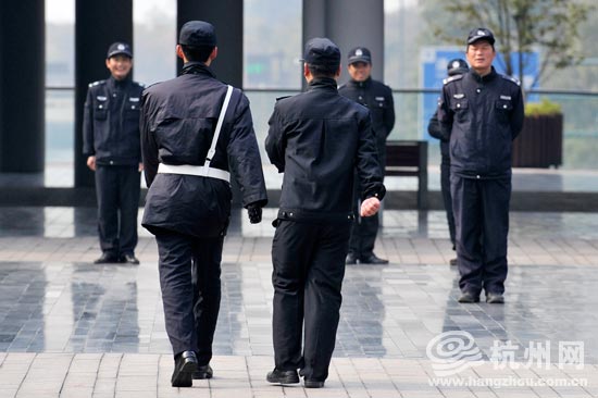 城市阳台上,几名保安趁着阳光在练队列。一名新来的保安有点同手同脚,同事们被逗笑了。
