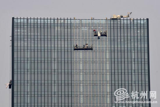 其实太阳出得也不爽快,只能算是雾里看花罢了。虽然明明知道晴天的希望不大,可是钱江新城一幢高楼上,工人们还是抱着侥幸爬上了绞车,从楼顶垂下来擦大厦的玻璃。