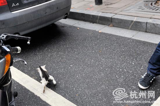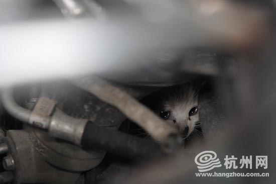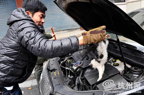 杭州网讯 下午凤起路上停了一辆私家车,引擎盖支起,车主拿着一把火钳,在发动机中间夹来夹去——有只猫钻到里面去了!