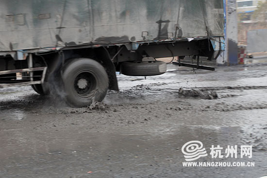 车辆驶过,带起泥水一片