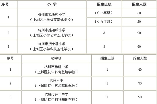 2012年,杭六中、开元中学、勇进中学也将分别成为上城区初中艺术、科技、体育基地学校。为促进基地学校的特色发展,今年这六所学校都将启动特长生招生工作,为更多有特长潜质的学生提供好的发展机会。