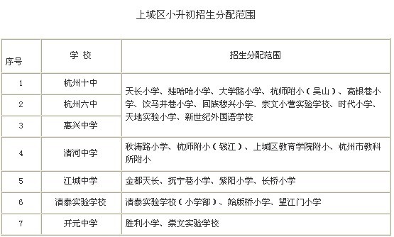 初中学校连片招生是上城区招生工作的创新,2012年将在前两年惠兴中学、杭十中成功连片招生的基础上,将范围扩大至杭六中。