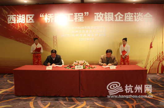 政府的信用,企业的成长价值,自然吸引了社会资本的涌入,由于一年来实施“桥隧工程”取得的成功,今天西湖区又与建行省分行和杭州银行签订了银政企合作协议书,两家银行总共授信100个亿的区域性意向信用额度。