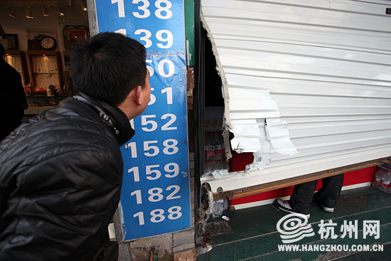 早上八点,店主许先生像往常一样来开店营业,但迎接他的却是被破坏了一角的卷闸门。