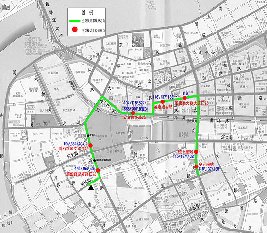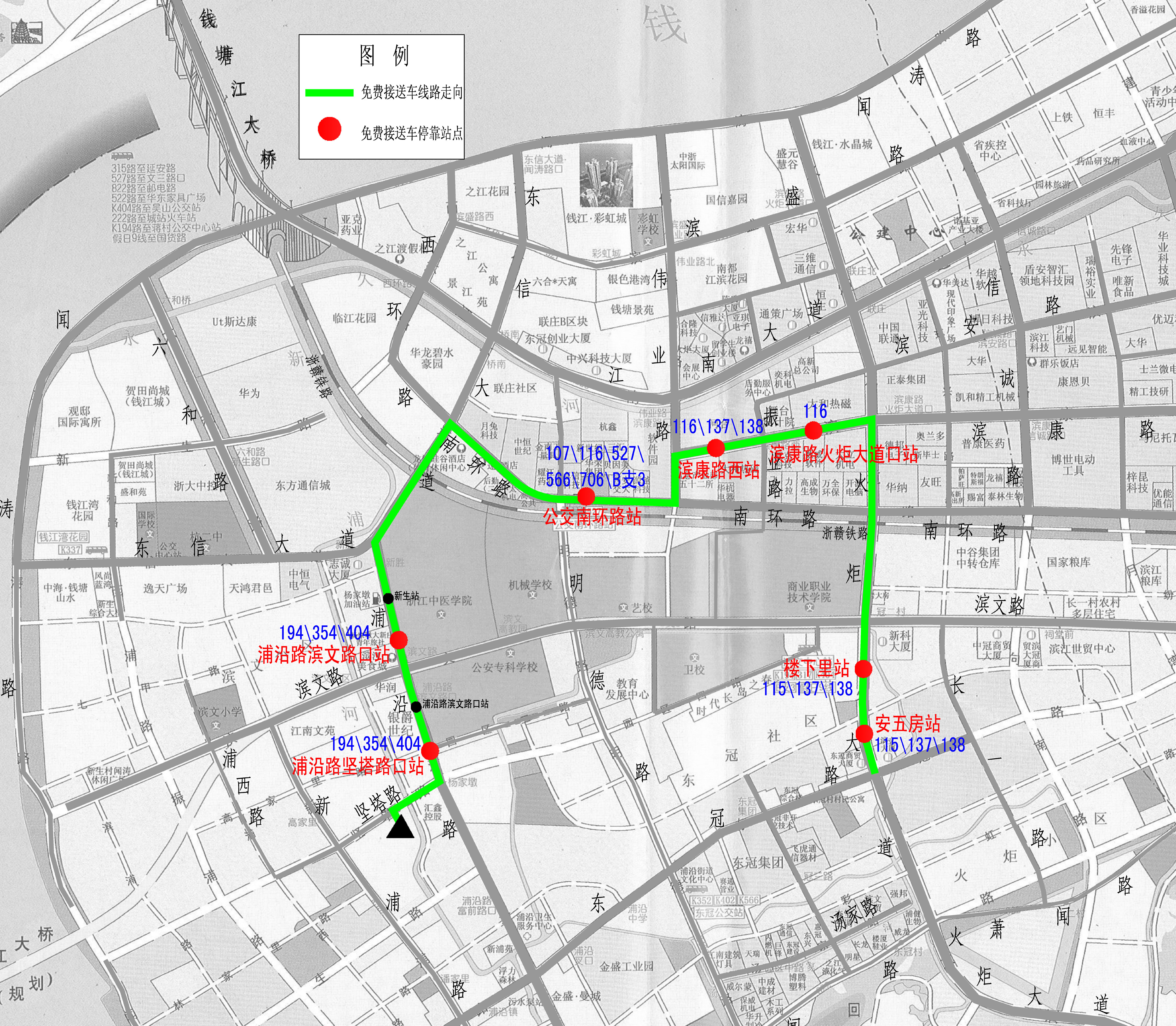3、自2012年3月28日起至滨文路恢复通车期间,我区以政府购买服务的方式开通免费接送车,利用免费接送车将施工路段两端及调整后公交线路主要换乘站连接起来,起讫站为安五房、浦沿路坚塔路口(见线路图),通过此线路可以免费换乘到原来经过滨文路的所有线路,以有效的解决居民和师生公交基本出行问题。接驳线中途停靠楼下里、滨康路火炬大道口、滨康路西、公交南环路站、浦沿路滨文路口共5对停靠站,安五房首班6:00,浦沿路坚塔路口末班20:00。