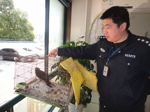 3月27日上午10点,采荷派出所接到了报警,说在江干区花鸟市场,看到一只鸟,很像是一头鹰,不知道会不会是一种国家保护动物。