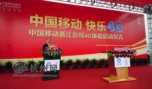 3月30日,“中国移动 快乐4G”中国移动浙江公司4G体验启动仪式在杭州黄龙体育中心东广场举行。仪式上,浙江省政府副秘书长孟刚、浙江省通讯管理局副局长李凯、杭州市政府副秘书长赵立康、中国移动浙江公司总经理钟天华、杭州市公共交通集团有限公司副总经理章贤春分别致辞。