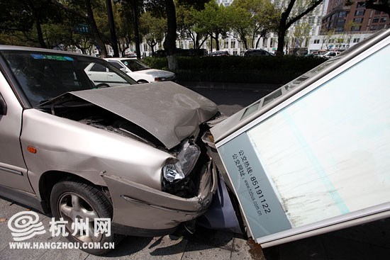 天目山路上 奇瑞车撞上公交站台(图)