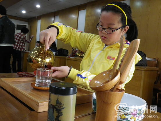 温杯洁具、清洗茶叶、敬奉香茗、揉搓闻香杯、小口品茗……十几道泡茶品茶程序在茶艺师罗老师的手中摆弄得得心应手,但到了小学员的手里可就大不相同了:既要记得动作要领,又要保证姿态优美,用沸水洗杯子的时候还得小心别把自己烫到!由于多数学员都是第一次动手体验如此专业的茶艺,所以 “忙活”也是在所难免的。