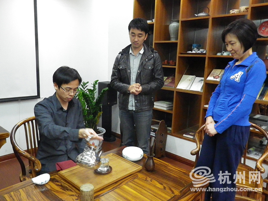 “我不是杭州人,他不是浙江人,开始创业的时候确实非常困难。”徐天伟说,但现在,在毕业后的两年中,他们的茶艺培训学校已经培养了900个学员了。当记者夸赞其他们的茶艺时,两个人还是很谦虚,甚至有点害羞,“我们就是特意跑来和老师学习的,我们在老师面前还只能算是‘班门弄斧’罢了!刚才还和老师学到了冰红茶的泡法,特别开心!”