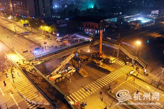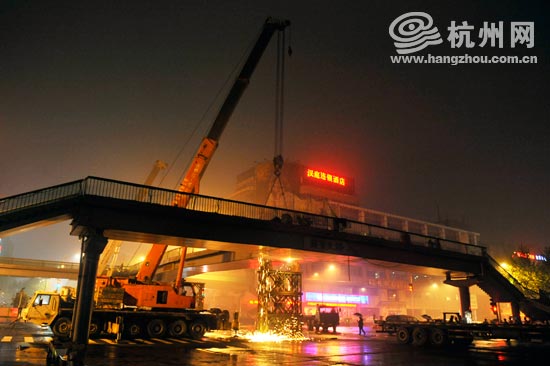 杭州市城市基础设施建设发展中心的吴赛钢工程师戴着顶安全帽站在桥下,他也是拆除工作的负责人。他说,天桥的拆除共花3天时间,每天从晚上11点干到明早6点,过程是这样的:第一天先将主桥梁切割掉,用吊机运下来,后两天分别拆除两边的部分。也就是说,第一晚一过,整体的解百天桥就将不复存在了。