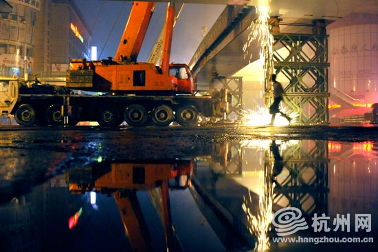 4月15日0:50,雨水的映衬下,解百天桥正在切割。