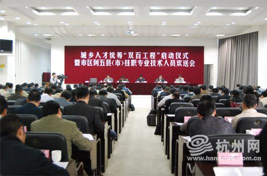 “发展需要人才做保证,人才对于地区的发展起到的是潜移默化的作用。”今天上午,杭州召开城乡统筹“双百工程”启动仪式暨市区到五县(市)挂职专业技术人员欢送会,会上,市委副书记王金财鼓励台下即将启程的66位技术人员要充分发挥自身专业优势,脚踏实地的为当地发展做贡献。市委常委、组织部长张仲灿出席会议。