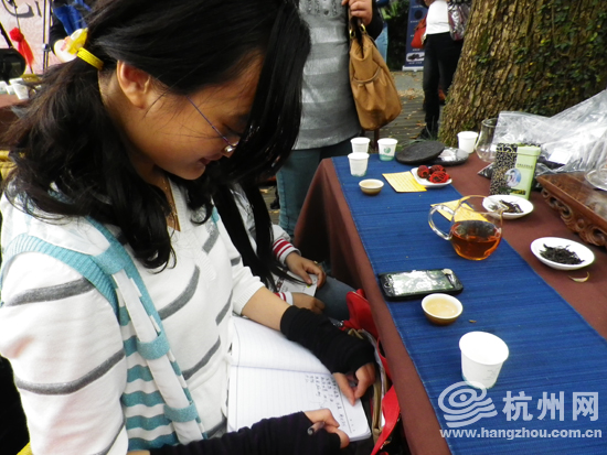 龙菊、铁罗汉、龙脊、水仙……特地从下沙工商大学赶来的小陈和小范同学,一个用手机一个用笔记本,每喝一道“龙茶”都要详细记下名字和产地,还有自己的口感,算是真正的铁杆龙茶粉丝了。“‘龙茶’实在太多了!不记下来肯定喝完就忘记了!”小范同学认真地说。
