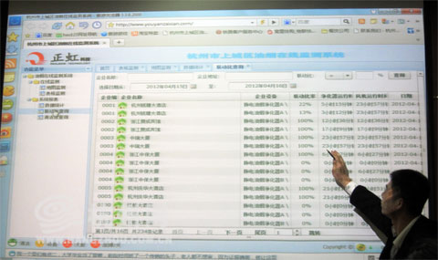 今天,记者在上城区环保分局看到了这套系统的运行,它简洁明了地反映出上城区103家酒店餐饮单位,共105台厨房油烟净化器的实时工作情况,以便环保部门对监控单位做出相关反馈。