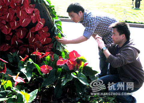 据了解,这些主题各不相同的静态花艺造型共有10多个,全部由鲜花直接栽种装饰而成。除了广场前的巨型“花毯”造型,还有寓意龙年吉祥的“双龙戏珠”造型,用红掌装点而成的“爱心墙”等。