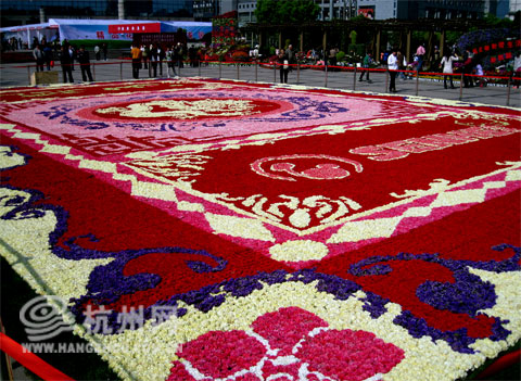 今年新增的花艺造型让大家眼前一亮。来到庆春广场上,最夺人眼球的莫过于一张绚丽多彩的“花毯”。这张花毯是由浙江森禾种业股份有限公司为本届展会量身定制,运用了独特的技术,采用50万支7种颜色的康乃馨和蓝色的勿忘我组合而成,面积达500平方米。