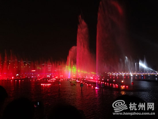 苏州金鸡湖畔的水景音乐喷泉与激光交相辉映