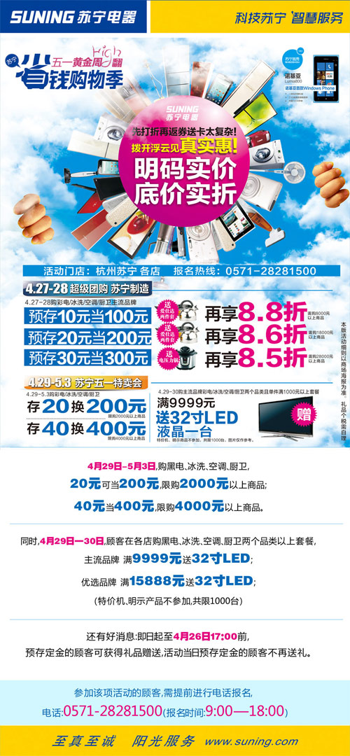 预交现金,10倍增值,再享震撼折扣。即日起至4月26日17:00前市民至苏宁各门店参加预存款10倍升值即送好礼,4月27日-28日购彩电、冰洗、空调、厨卫主流品牌再享8.5-9折的震撼折扣。4月29日-30日在杭州苏宁各门店购彩电、冰洗、空调、厨卫主流品牌,两个品类且单件满1000元以上的套餐满9999元送32寸LED电视一台,特价机、明示产品不参加,共限1000台。