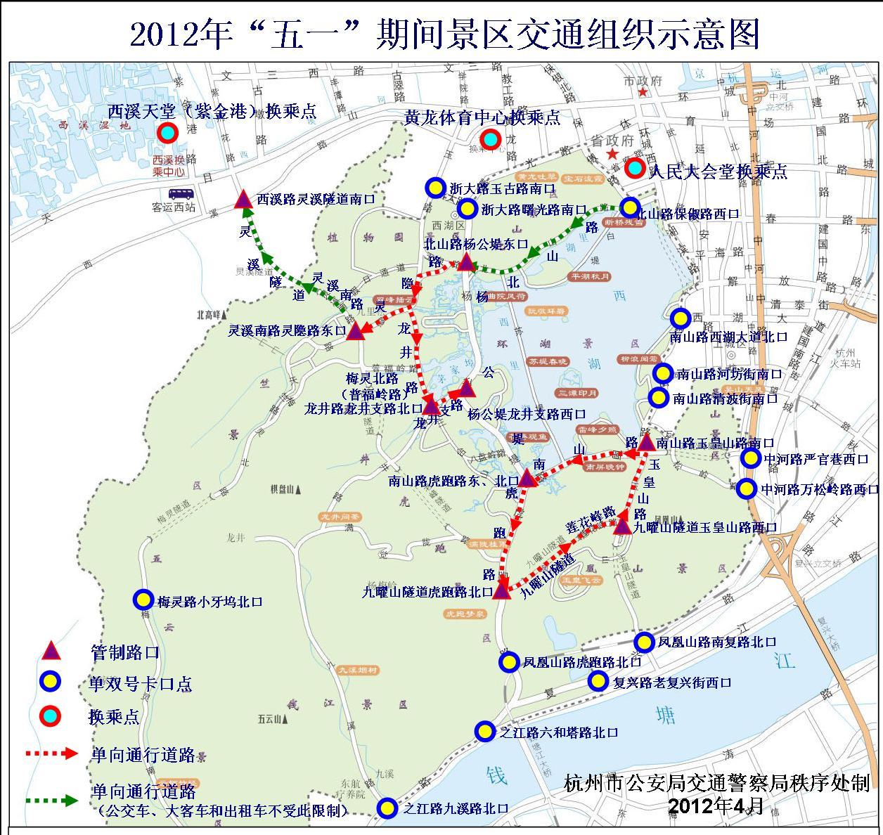 “五一”期间,西湖景区的交通组织管理措施,除凤起路(环城西路至保俶路段)不实行单向通行措施外,其余按照公安交管部门发布的《关于2012年春季旅游旺季景区、商贸区交通组织事项的通告》执行。