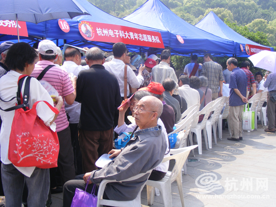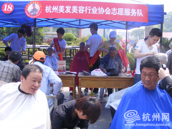 从中国美院青年志愿服务队队员的手里接过自己的画像,把90后的孩子乐得合不拢嘴;拎着自家的花花草草,来向杭州市护绿使者服务总队“求医问药”的爱花之人,自己也笑得像朵花似的满意而归了;为儿孙操劳惯了的大伯大妈在杭州师范大学青年志愿服务队的帐篷里,享受一下老年按摩的舒坦,心里美啊!杭州美发美容协会这里更是热闹,五十多号人一字排开,等着理发师们给自己剪出个美美的发型。有些大爷理完发还要向理发师敬个礼。这服务,满意!还有科技局志愿服务队的防震知识讲解、银行志愿服务队的假币识别和理财风险咨询……几乎每个服务队的招牌前都被市民们挤得满满当当。也难怪,因为18支志愿者队伍可都是带着自己的“看家本领”来为市民服务的!