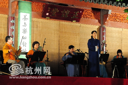 茶席间,笛家杜如松的《姑苏行》,黄正铭、周锦霞以高胡与古筝合奏《渔歌》,朱民铃唱诗《送孟浩然之广陵》,三支乐曲伴随着龙井茶的三次冲泡,起起落落间,袅袅余韵与悠悠茶香默契地互换了感官。就在此间,你终能入了‘若将耳听终难会,眼处闻声方得知’的茶禅世界了吧?