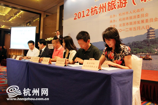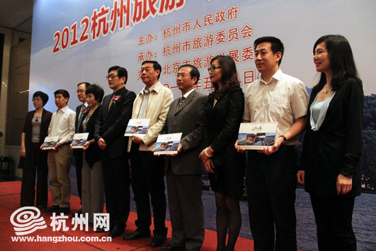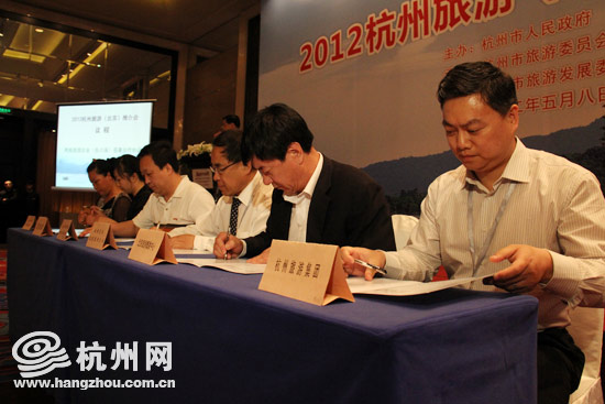 杭州市副市长张建庭向北京的旅行社代表赠送杭州“三江两岸”黄金线旅游联票