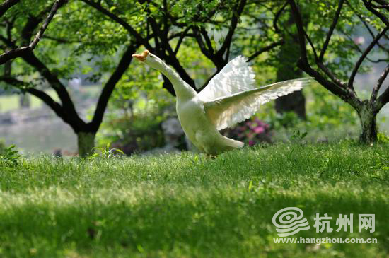 雪颈霜毛红网掌,在青山碧水的映照下,低头可见三三两两的鹅群在这晚春之色中“手舞足蹈”、“引吭高歌”, 抬头间又见檐上枝头“莺歌燕舞”、“鸟语叽喳”,让凝思静立的孤山更平添几分动感与生趣。