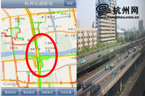 下午14时,记者用“杭州交通路况”软件进行实验。在位于杭州体育场路218号的杭州日报大楼里,记者用“杭州交通路况”(左图)查询中河高架的道路情况,右图为记者拍摄下的实际路面情况,绿色线表示畅通,红色线表示拥堵,橙色线表示短暂拥堵却在缓慢移动范围内。