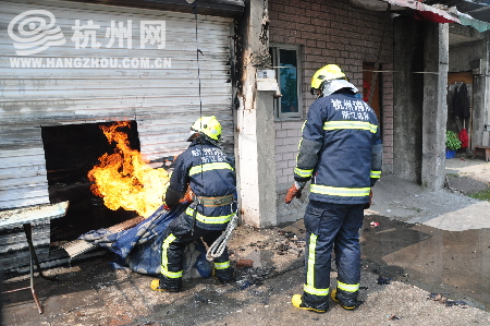 消防队员一边往火场里喷水,一边切开卷帘门,可不管这水怎么喷,屋子里的火就是没小下去。