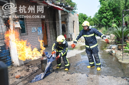 杭州网讯 虽然现在很多人家都接了管道煤气,但还是有很多人家、饭店在用煤气罐,万一煤气罐漏气而且烧了起来怎么办?消防队员告诉我们,煤气罐“喷火”烧得滚烫的时候,千万不要急灭明火,反而更可能爆炸。