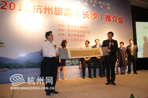 杭州市副市长张建庭向长沙市人民政府副市长黎石秋赠送西湖织锦