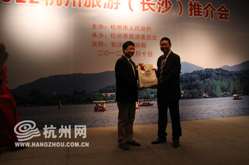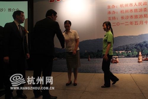 杭州市副市长张建庭向长沙的旅行社代表赠送杭州“三江两岸”黄金线旅游联票
